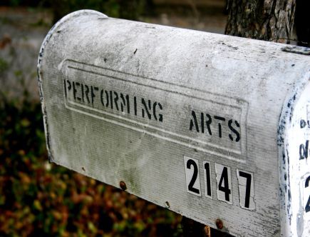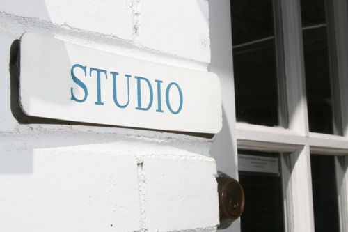 The studio is a two-story white house tucked behind shady oak trees and a red-paved brick driveway.